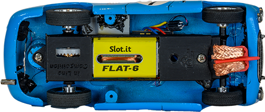 Das original Chassis war sehr instabil und hat vom Radstand her nicht optimal gepasst. Aus diesem Grund verbaute ich ein Penelope Pitlane Inline Competition Fahrwerk mit tiefer gelegtem Flat Motor. Dies erfordert ein Slot.it Offset Kronzahnrad.